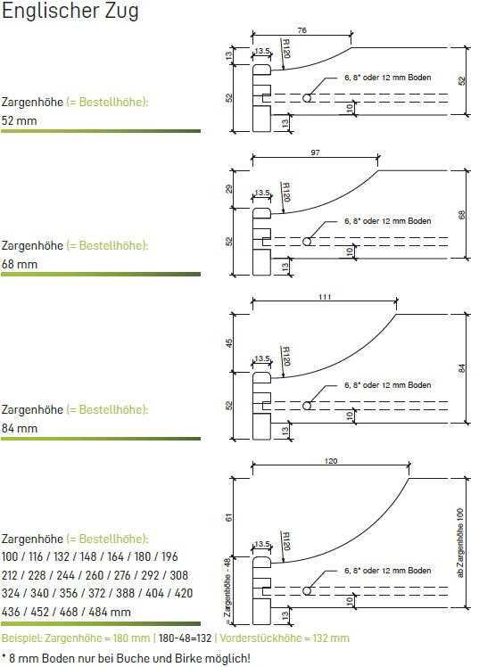 Ausführung: Englischer Zug oder Englischer Zug 45° erhältlich, Vorderstück 13mm tiefer gezogen.