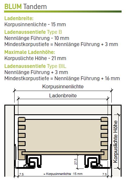 Berechnung der Schubladenbreite = lichtes Schrankmaß - 42mm = Schubladeninnenbreite.