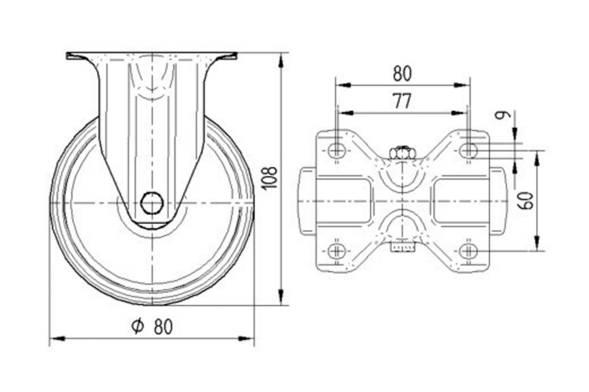 Laufrad- Durchmesser 80mm, Breite 34mm, Belastung 200kg, Bauhöhe 108mm