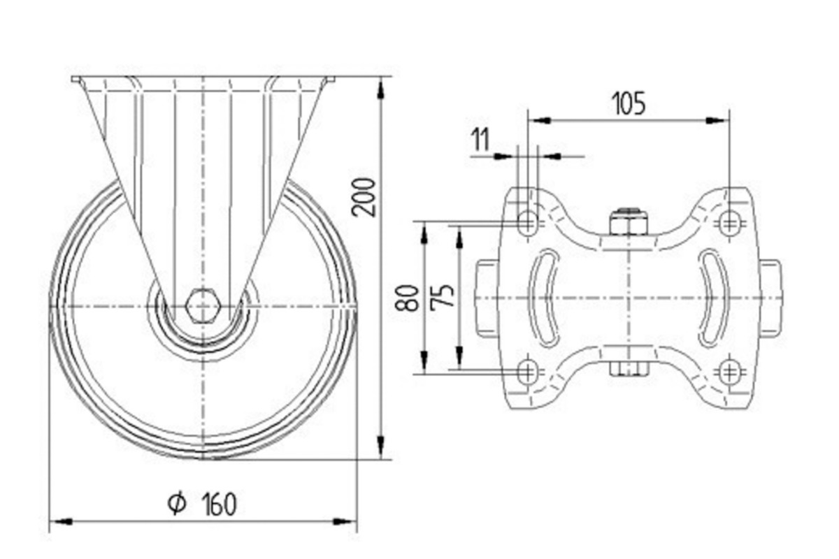 Laufrad- Durchmesser 160mm, Breite 40mm, Belastung 350kg, Bauhöhe 200mm