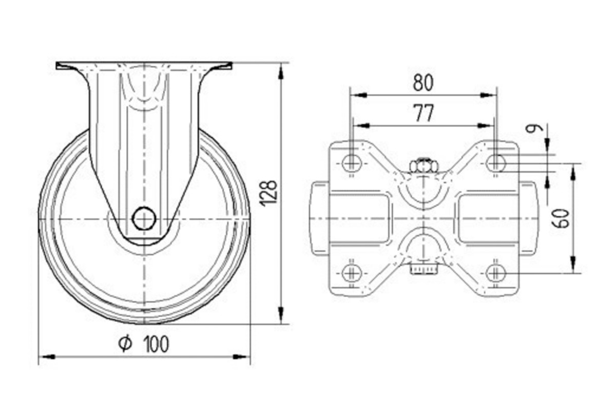 Laufrad- Durchmesser 100mm, Breite 36mm, Belastung 200kg, Bauhöhe 128mm