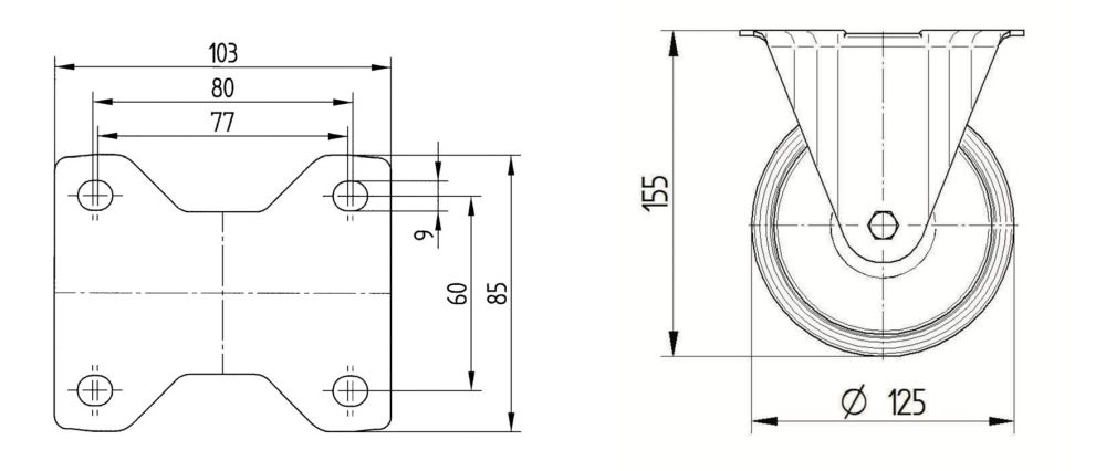 Laufrad- Durchmesser 125mm, Breite 40mm, Belastung 275kg, Bauhöhe 155mm