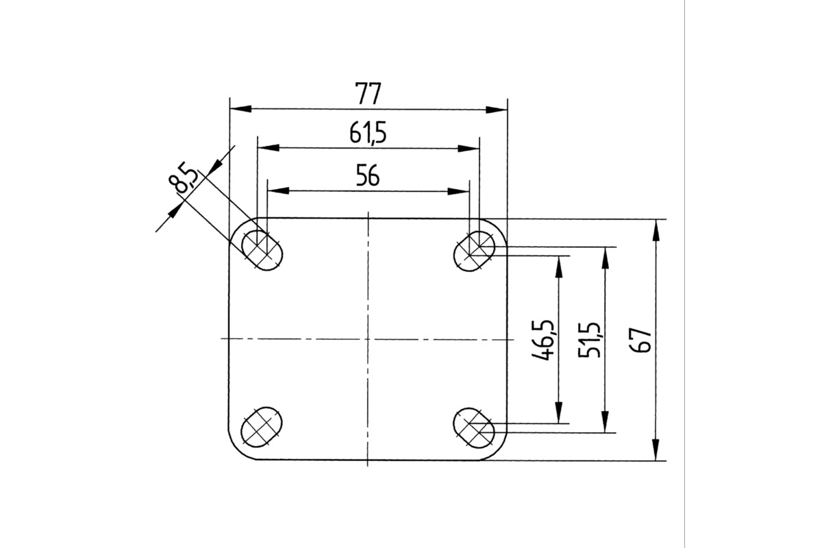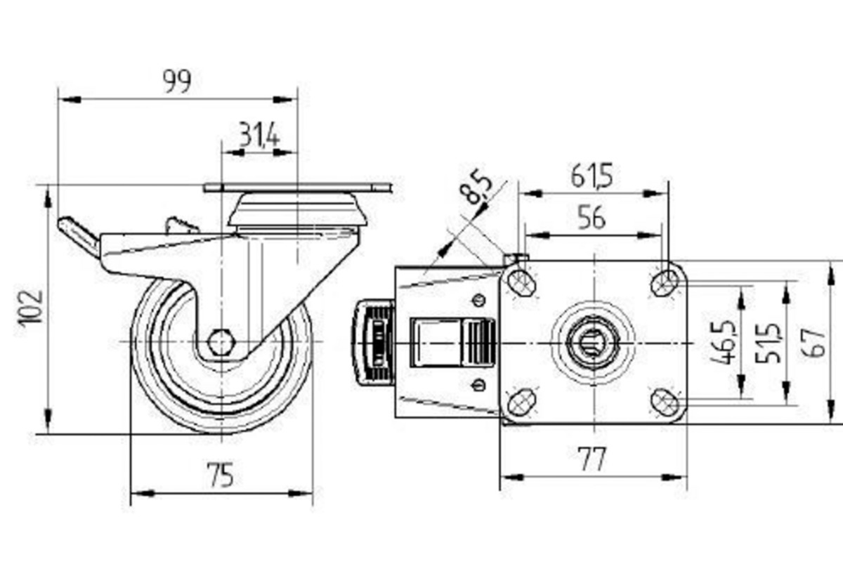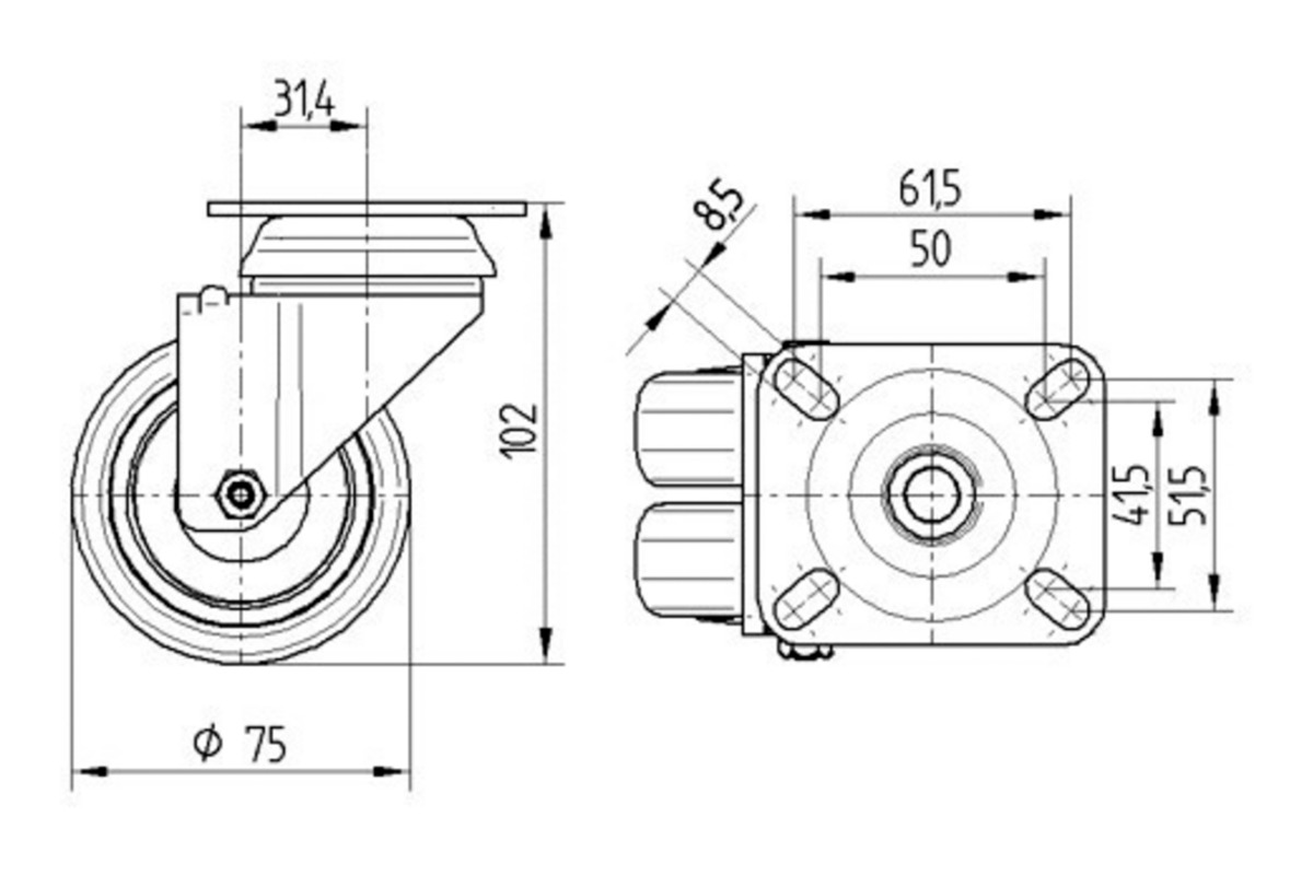 Laufrad- Durchmesser 100mm, Breite 2x25mm, Belastung 100kg, Bauhöhe 102mm, Anschraubplatte 77x77mm.
