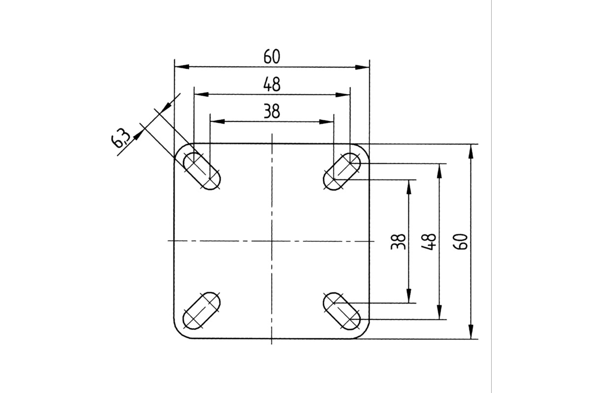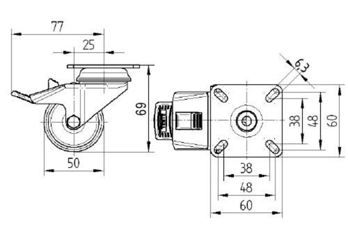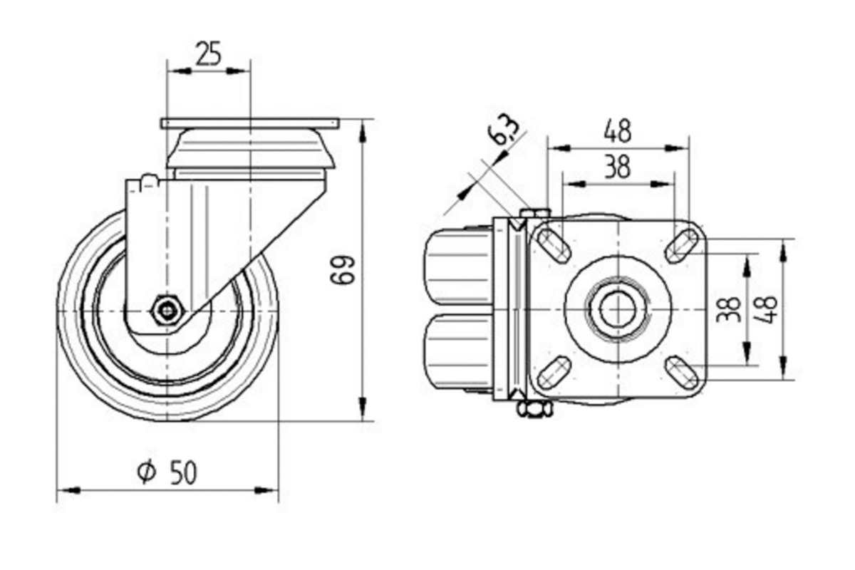 Laufrad- Durchmesser 50mm, Breite 2x19mm, Belastung 60kg, Bauhöhe 69mm, Anschraubplatte 60x60mm.