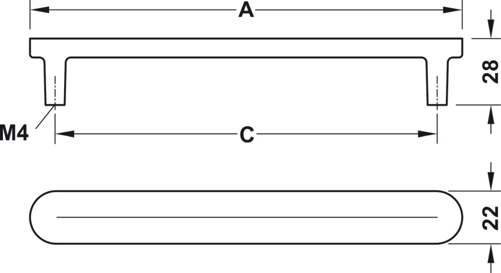 Maße: Bohrabstand (C) + 21mm = Gesamtlänge (A), Breite 22mm, Höhe 28mm.