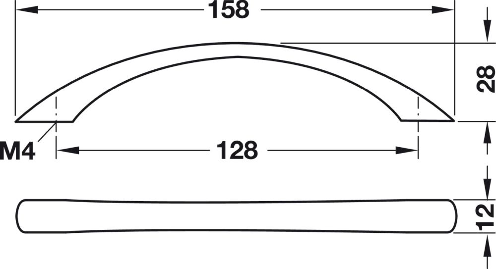 Maße: Bohrabstand 128mm, Gesamtlänge 158mm, Höhe 28mm.
