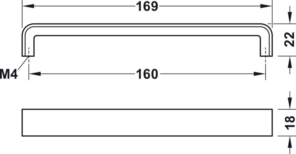 Maße: Bohrabstand 160mm, Gesamtlänge 169mm, Höhe 22mm, Breite 18mm.