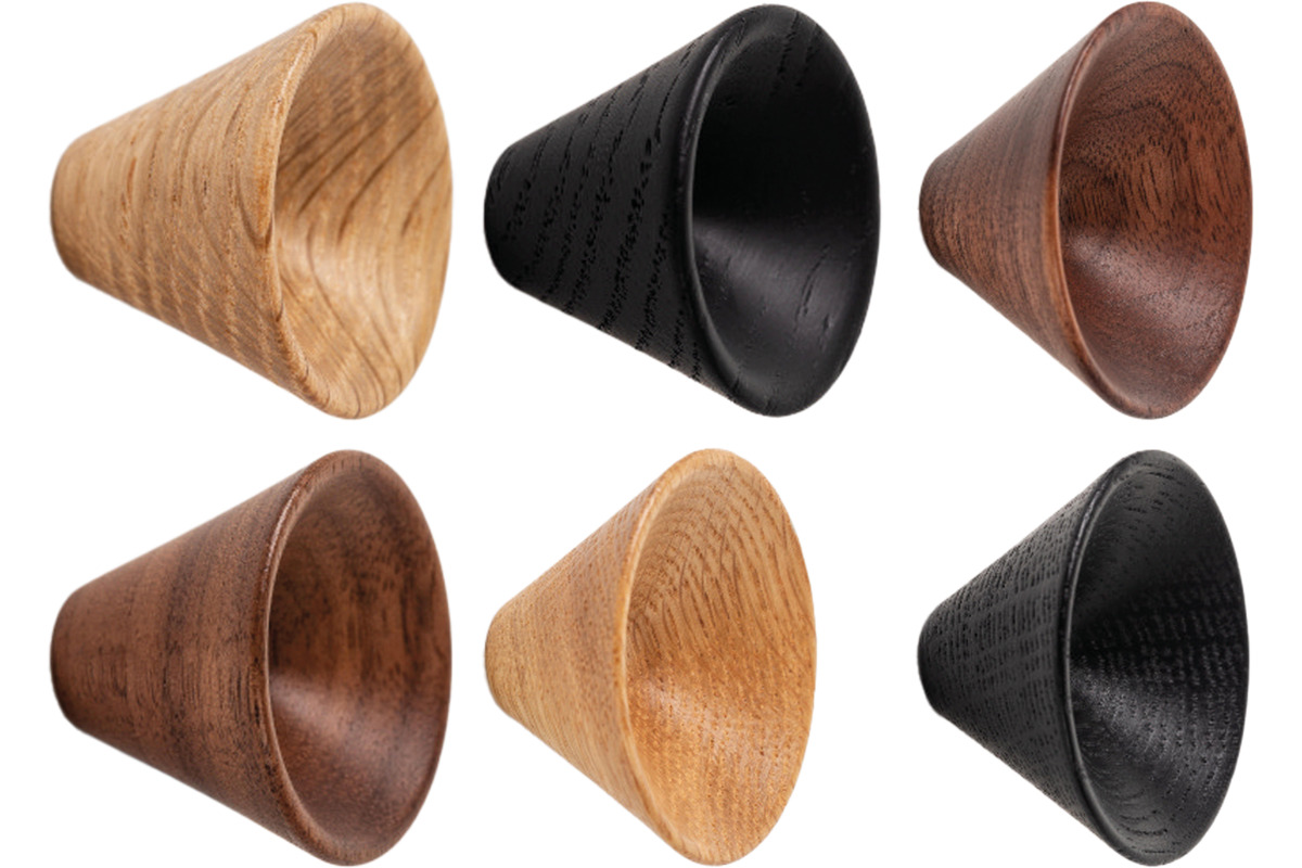 Holzknopf zum Anschrauben, Eiche, Walnuss und Esche schwarz. Holz lackiert, Herkunft Spanien.
