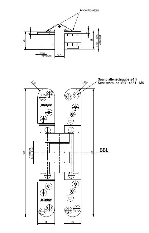 Anwendung: stumpf einschlagende Türen, bei geschlossener Tür ist das Band unsichtbar; 3-dimensionale Verstellung,