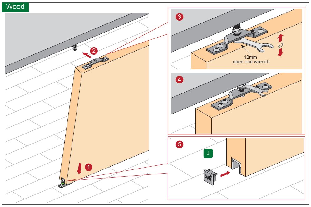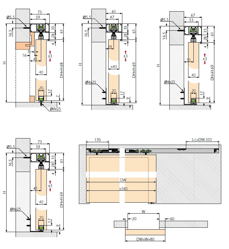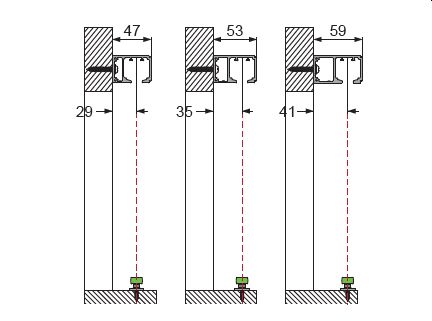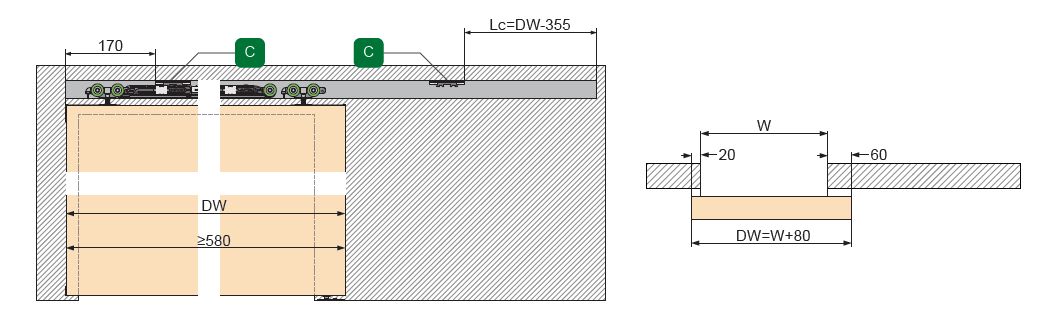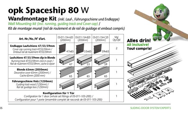 Schiebetürsystem SPACESHIP Ausführung Wandmontage mit beidseitiger Dämpfung, für Holztüren 35 - 45 mm, ab Türbreite 580mm / bis Türgewicht 80 kg, Höhenverstellung±3mm.