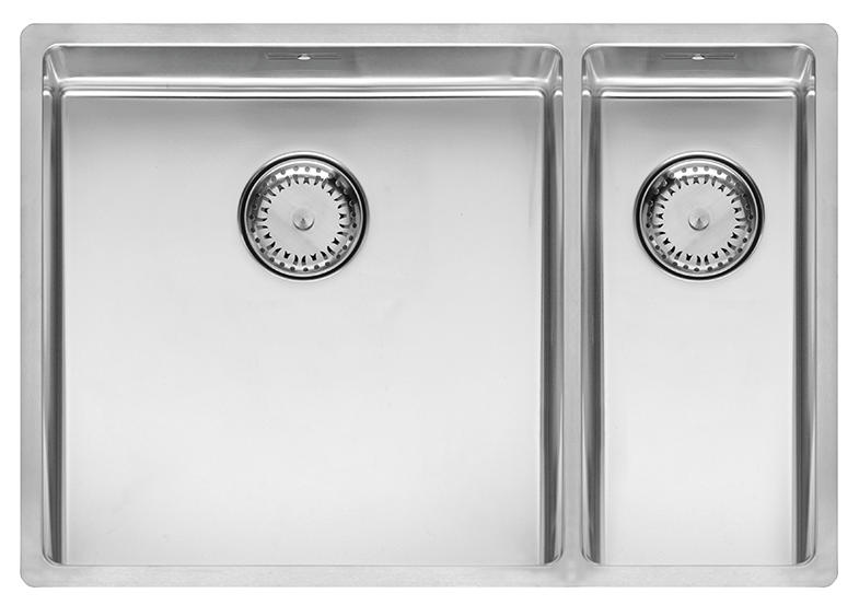 Edelstahlspüle Seidenglanz Innenradius 10mm, Außenradius 10mm mit Siebkorbventil 3,5", geeignet für Unterbau, Flacheinbau und flächenbündigen Einbau. Die Angabe Becken links / rechts definiert die Lage des großen Becken.