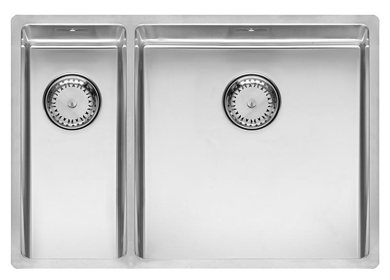 Edelstahlspüle Seidenglanz Innenradius 10mm, Außenradius 10mm mit Siebkorbventil 3,5", geeignet für Unterbau, Flacheinbau und flächenbündigen Einbau. Die Angabe Becken links / rechts definiert die Lage des großen Becken.